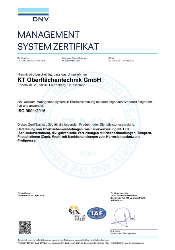 Die KT Oberflächentechnik GmbH hat ein Energiemanagement-System nach ISO 50001 eingeführt und intern auditiert. Damit wurden die Voraussetzungen geschaffen, um die externe Zertifizierung durchzuführen.
